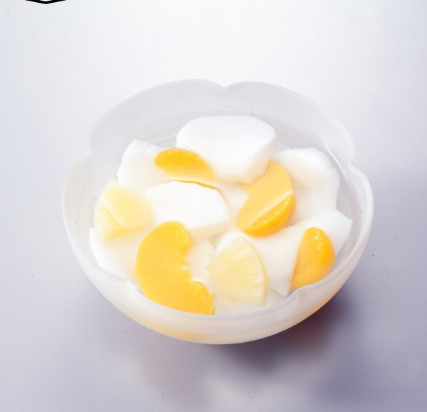 特製杏仁豆腐 用湯匙舀起每顆杏仁豆腐。搭配三種水果(黃桃、柑橘、鳳梨)一起享用。
